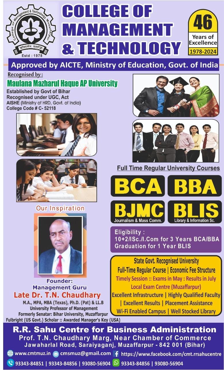 College of Management & Technology has been sponsored by College of Management Studies (CMS), which was inaugurated by the then Chief Minister of Bihar Late Karpoori Thakur at Patel Maidan, Samastipur on 15th November, 1978 in presence of Chief Guest Sri Guneshwar Prasad Singh (then State Minister of Higher Education, Science & Technology), Special Guests were Er. S.N. Singh (Project Manager, IDPL, Muzaffarpur) and Prof. T.N. Chaudhary (Faculty of Management, Bihar University) and the function at Patel Maidan was presided over by Sri Ramavatar Sharma, then Director of Warehousing Corpn. Bihar. CMS was set-up in June, 1978 and got Registered under SR Act, 1860 (vide Regn. no. 387 of 1978-79). In April, 1979 the institution got shifted to Muzaffarpur by a Resolution dated 22/04/79 from Samastipur.
